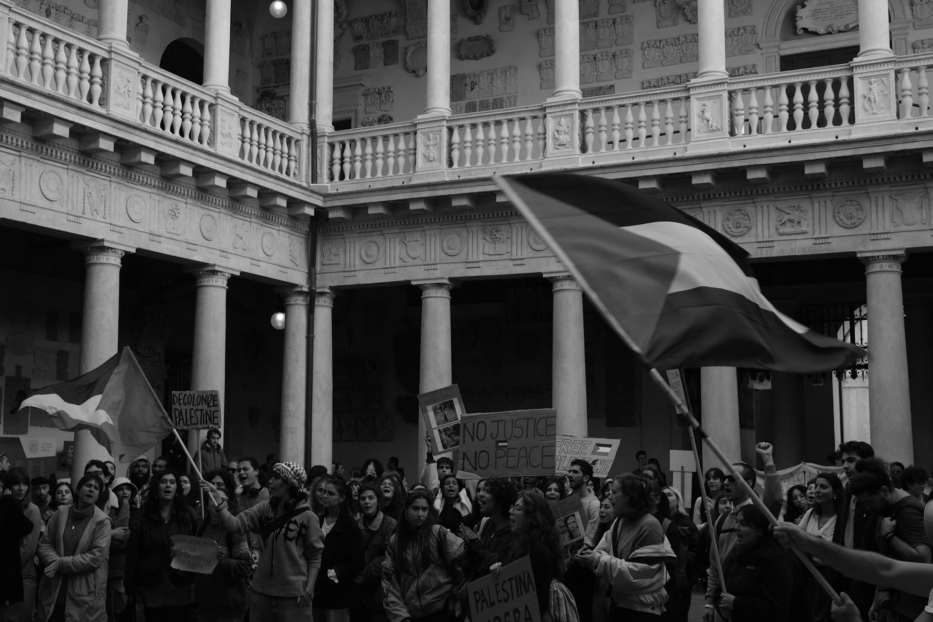On November 11, 2023, a large public demonstration took place at the heart of the University of Padova, specifically at The Bo Palace. Demonstrators gathered to exert pressure on the university administration, urging their alignment with the Free Palestine movement. Padova, 11/11/2023