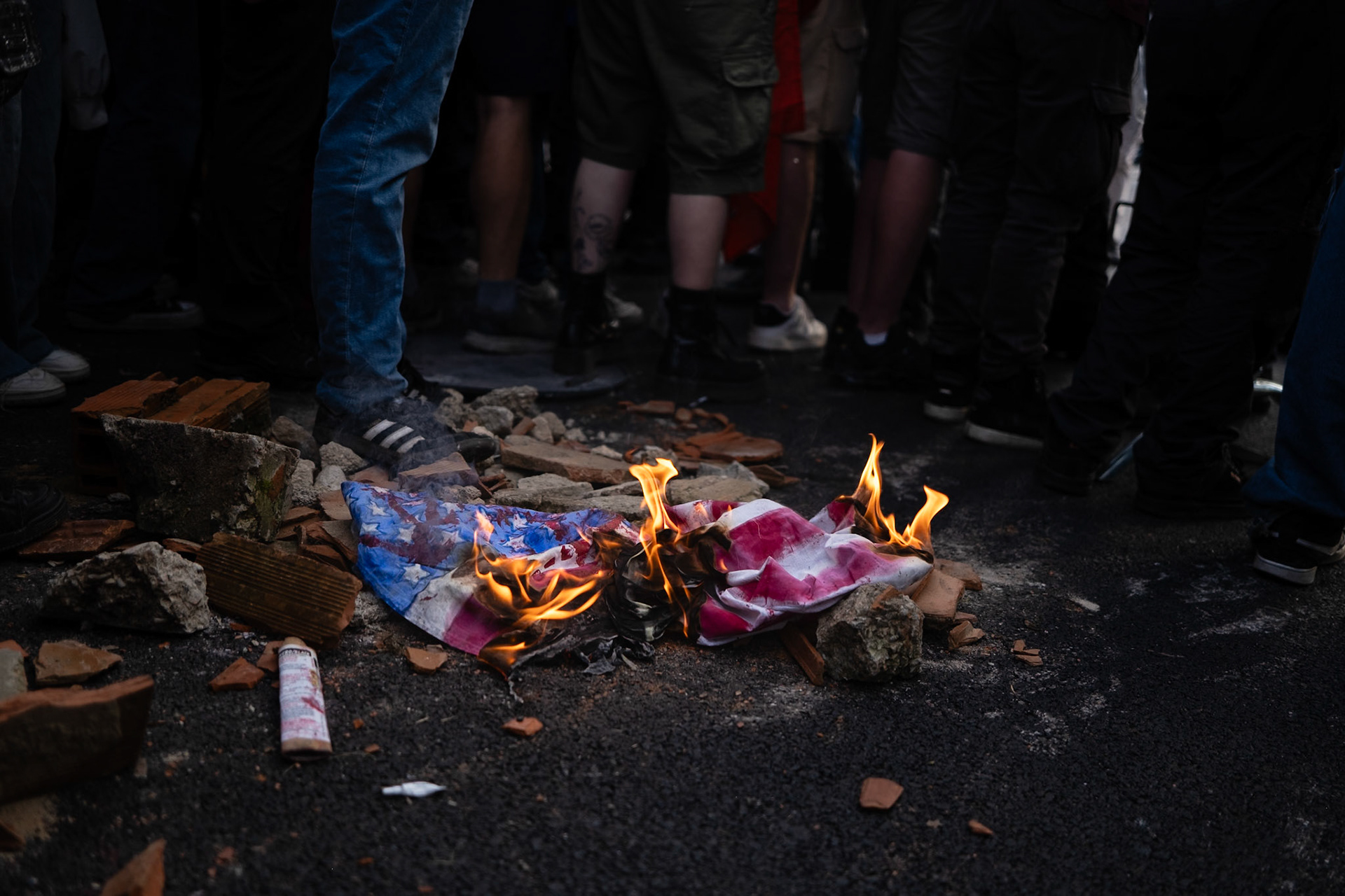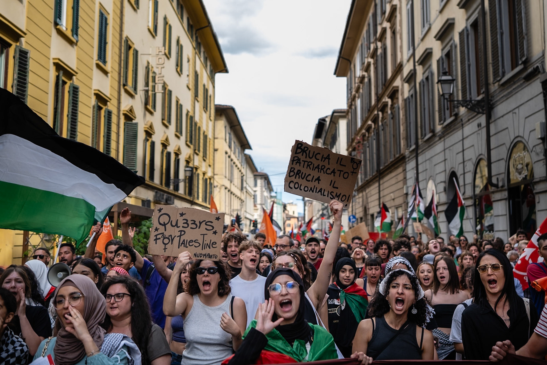 Florence responded strongly to the call of giovanipalestinesi.it for a national demonstration against Republic day. Hundreds of people marched through the city center, emphasizing the importance of condemning the ongoing genocide in Palestine. The protest ended in front of the American consulate, where protesters denounced the substantial aid provided to Israel and burned the United States flag. There were moments of high tension and some police charges against protesters who attempted to approach the consulate. Firenze, 02/06/2024